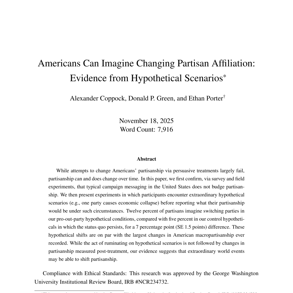 Coppock, Alexander, Donald P. Green, Ethan Porter. 2026. Americans Can Imagine Changing Partisan Affiliation: Evidence from Hypothetical Scenarios. Quarterly Journal of Political Science.